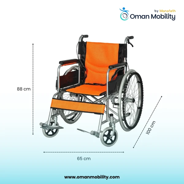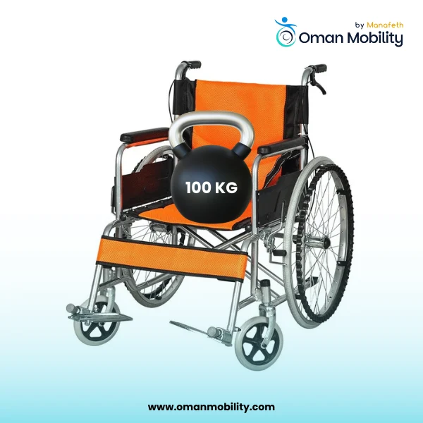 Durable Wheels: Manual wheelchairs from Oman Mobility offer stable and smooth movement with solid front wheels and large ring rear wheels.